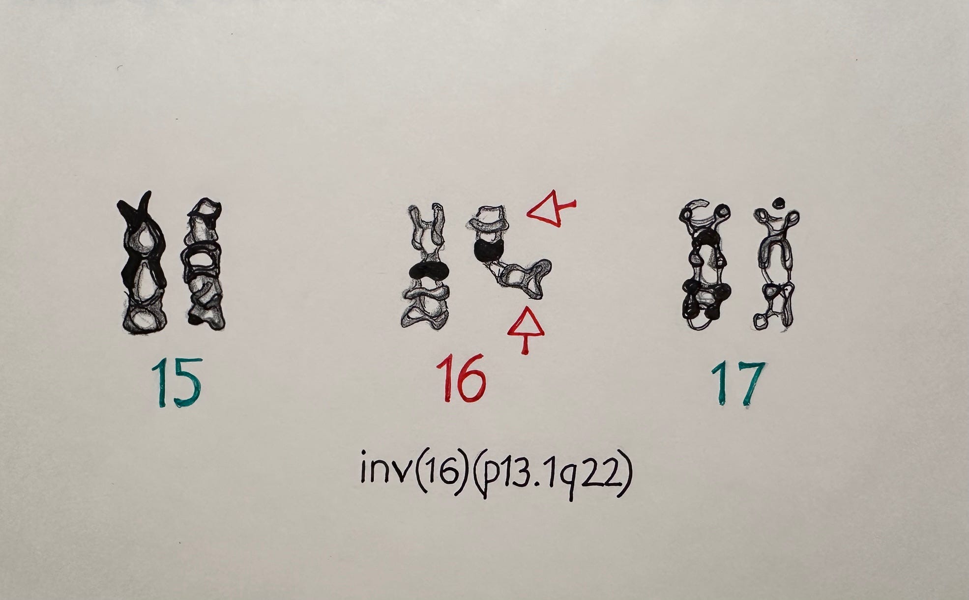 Like Schlossberg, I had acute myeloid leukemia, AML. But for me, it was the 16th chromosome of a blast cell that flipped upside-down, whereas for her, it was the 3rd. Just that: a different chromosome. A microscopic distinction that means the difference between likely survival (given extreme doses of chemo) and almost certain death.